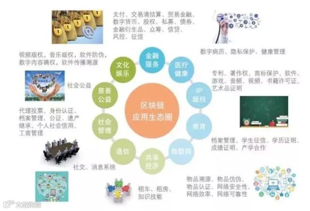 这张图是工信部之前的一个区块链白皮书中,对区块链应用场景的总结。大家可以看到,大大小小的各种行业,包括金融、医疗、版权、物联网、共享经济、通讯行业、社会治理、社会公益、文化文娱大文娱产业等等都有。