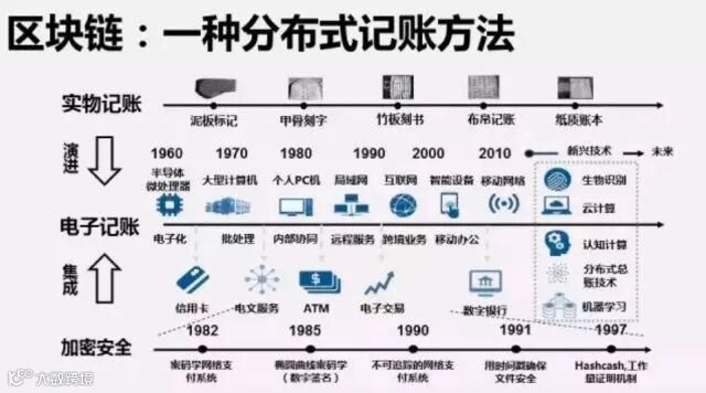 最早是通过泥板标记,到甲骨刻字,再发展到纸质账本,以及到六十年代记账的模式的电子化。一直发展到最近十年(比特币在2009年出现)我们在研究区块链。其实这就是人类记账方式的一个自然的演变的过程。