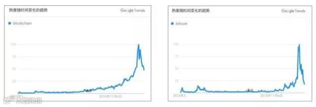 这两幅图是google搜索上“比特币”关键词的查询热度历史变化图,大家可以看到,跟比特币的价格变化是比较类似。都是经历一个比较平缓的时期,到最2015年、2016年左右,有了一个大幅度的提升。