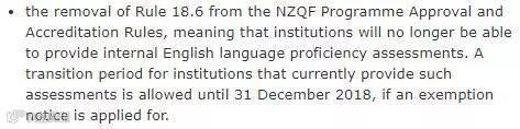 “从NZQF计划批准和认证规则中删除18.6项,这意味着,教育机构无法再继续提供内部英语评估测试。”
