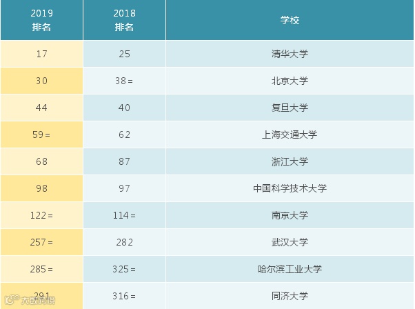 根据最新发布的2019年QS世界大学前100的排名榜单中,中国内地有6所进入了榜单中。如下图: