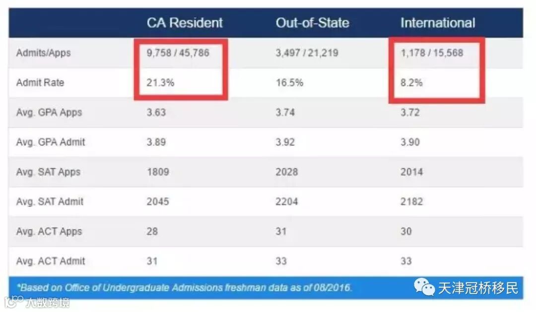 2016年的录取数据中,请看标红的框,左边,加州本地学生录取数量9758个,右边,国际学生录取数量是1178个,录取率,国际生录取率为8.2%,加州本地录取率为21.3%。由此可见,绿卡身份尤其是本地人身份对于名校录取有着巨大优势。