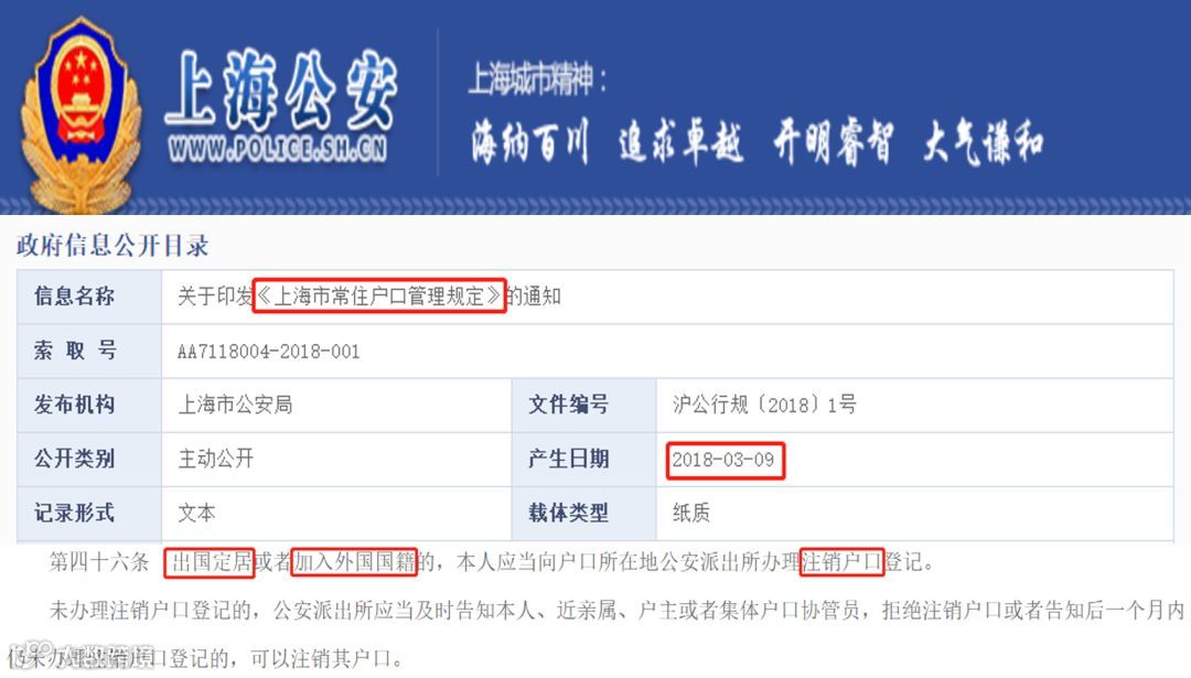 日前,上海公安公布《上海市常住户口管理规定》,其中第四十六条规定:“出国定居或者加入外国国籍的,本人应当向户口所在地公安派出所办理注销户口登记”。