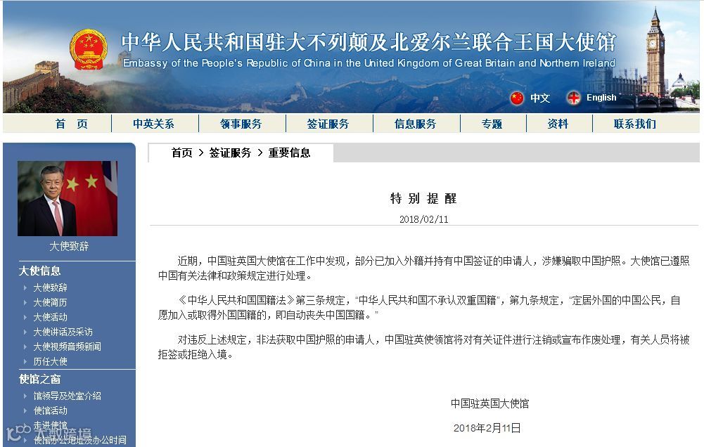这篇文章的依据是今年2月份中国驻英国大使馆出的一则“特别提醒”(如下图)。