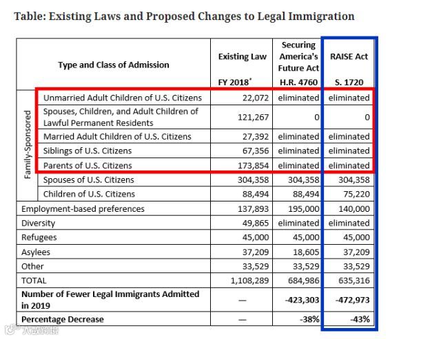 右侧的蓝色方框内的《RAISE ACT S.1720》,是指2017年2月,由共和党参议员科顿(Tom Cotton)和普渡(David Perdue)提出《改善美国就业机会的移民改革法》(《Reforming American Immigration for Strong Employment Act》。
