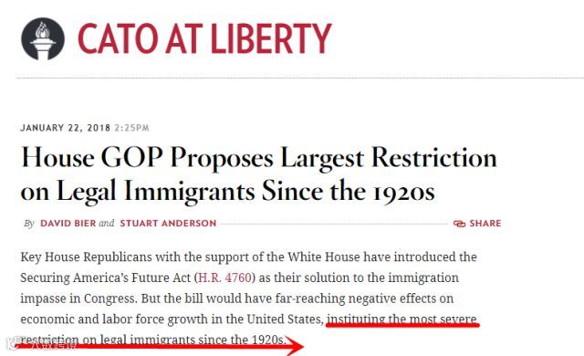 卡托研究所(Cato Institute)昨天公布了这份由现任联邦众议院司法委员会主席的古德拉特(Bob Goodlatte)提交的名为《捍卫美国未来法案》(Securing America's Future Act of 2018)(HR 4760),卡托研究所也直接称其为自1920年以来最严苛的移民限制。