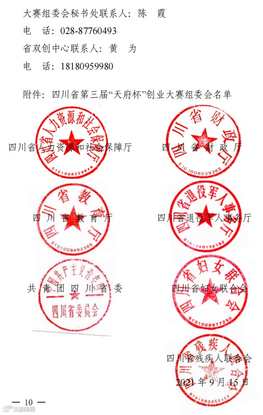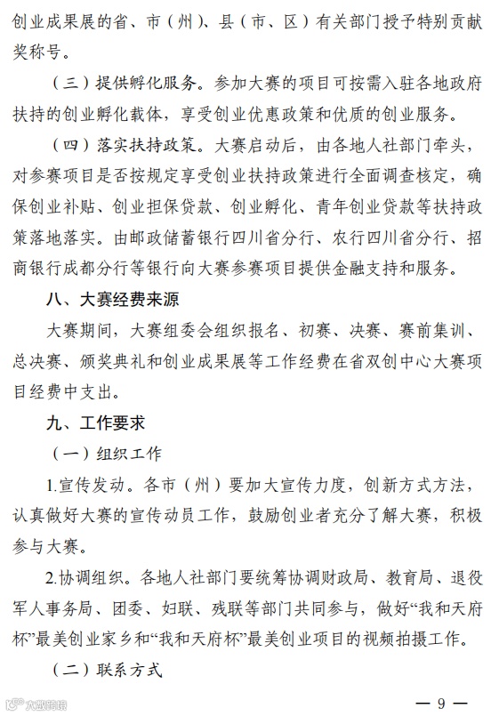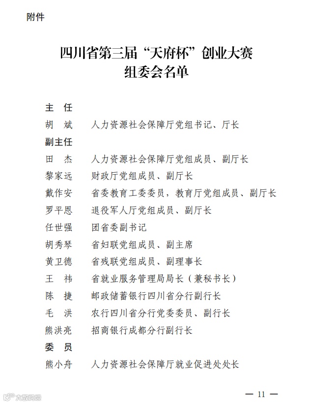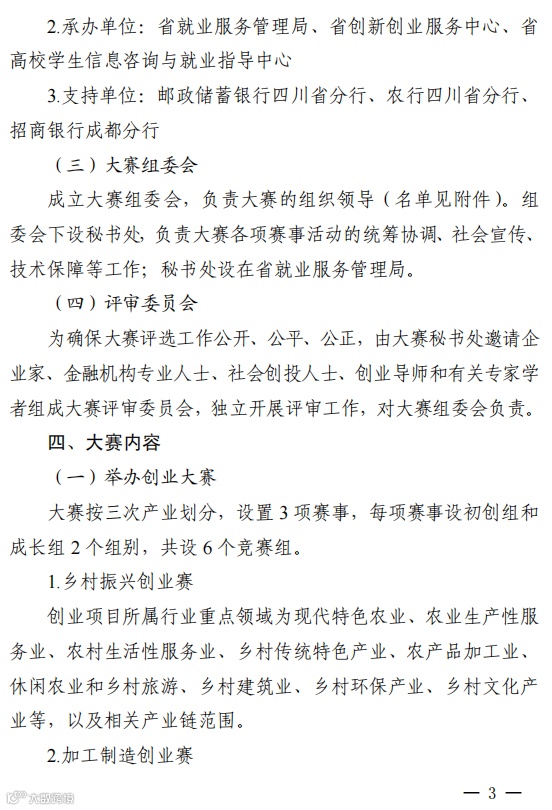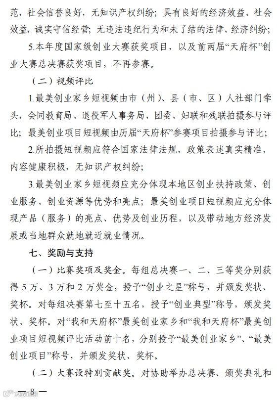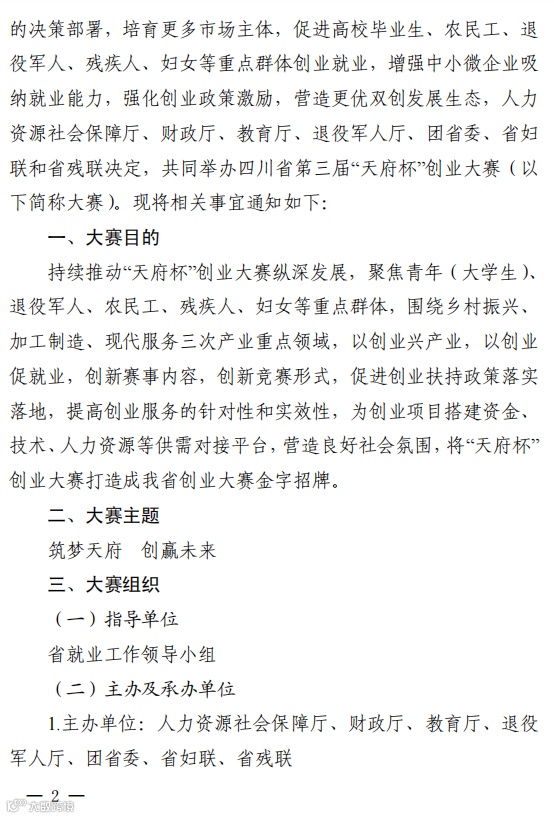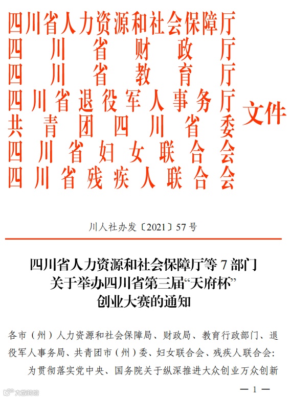 为进一步促进创新创业在全省的开展,激发广大创业者适应时代要求,培育更多市场主体,促进高校毕业生、农民工、退役军人、残疾人、妇女等重点群体创业就业,增强中小微企业吸纳就业能力,强化创业政策激励,营造更优双创发展生态,省人力资源和社会保障厅、财政厅、教育厅、退役军人厅、团省委、省妇联和省残联决定,共同举办四川省第三届“天府杯”创业大赛。
