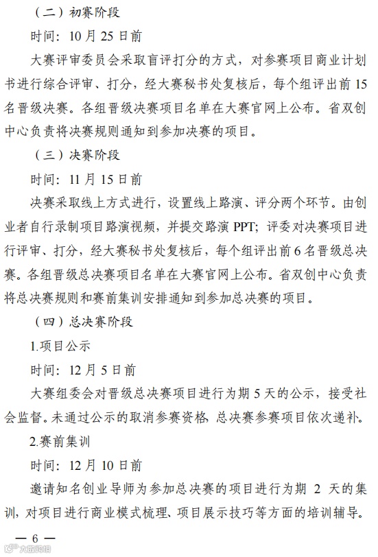 10月25日前为初赛阶段,大赛评审委员会采取盲评打分的方式,对参赛项目商业计划书进行综合评审、打分,经大赛秘书处复核后,每个组评出前15名晋级决赛。