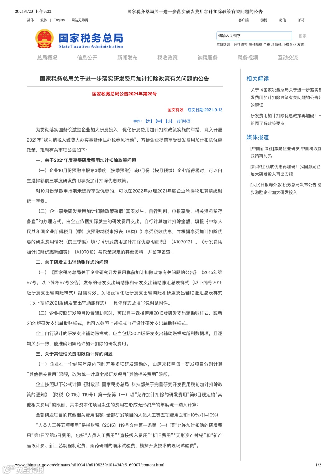 2.除烟草制造业以外的制造业企业开展研发活动中实际发生的研发费用,未形成无形资产计入当期损益的,在按规定据实扣除的基础上,自2021年1月1日起,再按照实际发生额的100%在税前加计扣除;形成无形资产的,自2021年1月1日起,按照无形资产成本的200%在税前摊销。