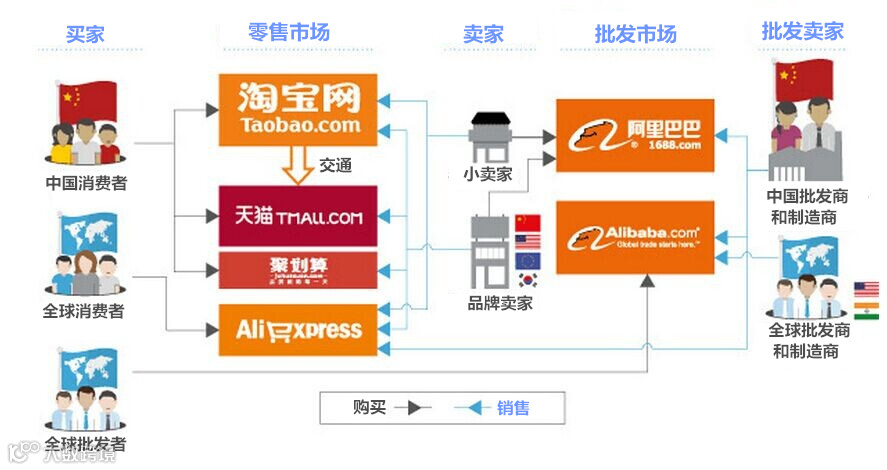 阿里巴巴是中国最大的电子商务公司,旗下拥有3大网站:淘宝网,Alibaba.com以及天猫商城。其中,淘宝和天猫的活跃买家数超过2.31亿,活跃的卖家数大约为800万。