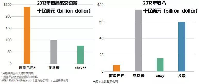 2013年阿里巴巴活跃客户在移动交易端的交易量高达2400亿美元,占中国移动端电子商务总交易额的76.2%,比amazon和ebay加起来的交易额还要多,成为全球第一。