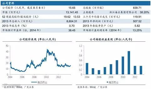 主营业务。药品的生产,有效期至 2015 年 12 月 22 日),兽药的生产、销售,有效期至 2016 年 12 月 30 日;一般经营项目:经营进出口业务,医药相关产业产品及健康相关产业产品的研发、技术服务,翻译服务,信息技术服务,培训服务(不含办班培训)。2013 年公司实现主营业务收入 84.79 亿元,同比增长48.62%;利润总额 6.62 亿元,同比增长 100.44%;归属于母公司股东的净利润实现3.02 亿元,同比上涨 0.19%。报告期内,海正制剂销售收入占自产产品销售收入比重较去年同期提高了 10 个百分点,海正产品总体毛利率提高了近 9 个百分点。体现了公司从原料药向制剂转型朝着预期的方向发展。