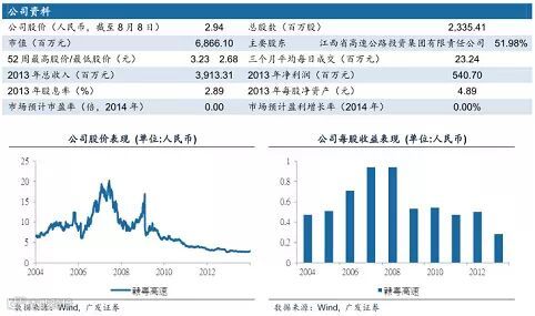 主营业务。上市以来主营业务未发生变化,主要从事高速公路的投资、建设、管理、收费和养护等。2013 年,公司实现营业收入 39.13 亿元,较上年同期增加 10.00%;营业成本 21.65 亿元,较上年同期增加 27.97%;营业利润 5.67 亿元,较上年同期减少 54.20%;归属于上市公司所有者的净利润为 6.54 亿元,较上年同期下降 44.11% 。截至 2013 年年末,公司总资产 281.19 亿元,较年初增长 9.70%;归属于上市公司所有者权益 114.27 亿元,较年初增长 4.11%。