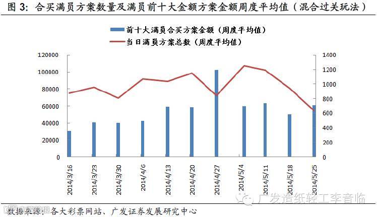 合买方案如果满员,不久之后将完成出票,意味着网上购彩的完成。而每日满员合买方案的数量是当日客户活跃度的标杆,同时满员的方案金额越大,表明彩民对下注方案或合买发起人越有信心。鉴于网站暂时无法统计所有彩种的总满员方案数,而混合过关玩法是竞彩中热度最高的玩法,因此我们选取竞彩混合过关玩法每日满员方案数量及满员前十大金额方案进行跟踪统计,作为购彩热度指标,并对其进行周度平均,以反映每周购彩热度的变化。