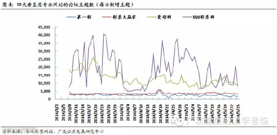 在彩票论坛中发出一个主题,往往能够引发其他彩迷朋友的回复,但是回复的内容并不一定是有质量的关于彩票或者足球赛事的信息,因此单纯的发帖量并不能反映一个论坛为用户所提供的讨论氛围是否足够热烈。而主题一般围绕某一个具体问题而展开,主题数量一定程度上更能反映论坛的讨论氛围激烈程度。为对比各大垂直类专业彩票网站的论坛人气,我们从2014年3月1日起,对论坛每日新增主题数进行日度跟踪,并进行周度对比。