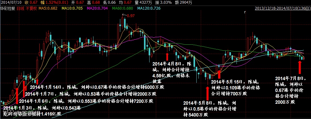 根据香港交易所昨晚披露的信息,华彩控股(1371.HK)实际控制人刘婷、陈城于2014年7月8日增持公司股票共计2000万股,增持价格为每股0.67港元,较当日收盘价的折价率为1.48%。根据公开披露的信息,这已经是公司实际控制人今年以来的第八次增持行为,累计增持股份已达8.33亿股。