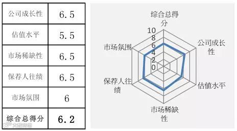 综合评分总得分 =(市场氛围评分 + 公司成长性评分 + 估值水平评分 + 市场稀缺性评分+保荐人往绩评分)之平均数
