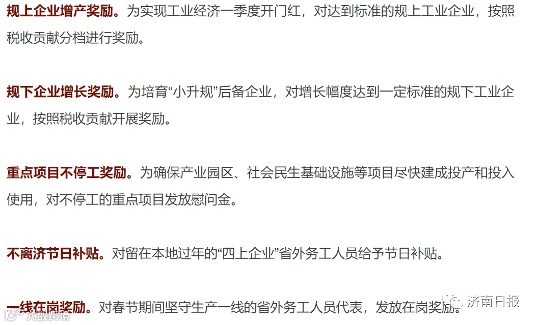 东营市人社局1月21日发布通知,对春节期间(2月1日到3月1日)不停工的重大工程、重大项目外来务工人员,每人发放1000元现金补助。全面排查欠薪隐患,及时处置矛盾纠纷,确保春节前欠薪问题清零。开通快速申领通道,对符合条件人员及时兑现失业保险待遇、临时生活补助。鼓励用人单位适当提高食宿标准,确保外来务工人员吃上可口的年夜饭。倡导用人单位向远在家乡的员工家属献上一份祝福、送上一份年货。