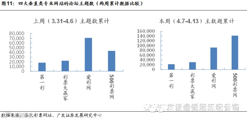 从周度累计主题数上看,上两周500彩票网的论坛活跃度略有下降,本周500彩票网论坛强势回归,证明了其作为行业龙头的稳固地位。