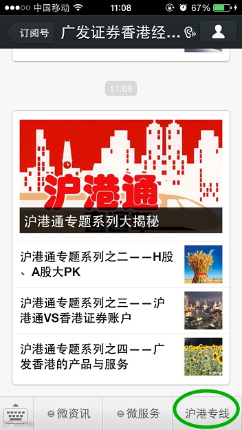 特色:新添一级菜单栏三个,“微资讯”“微服务”“沪港专线”: