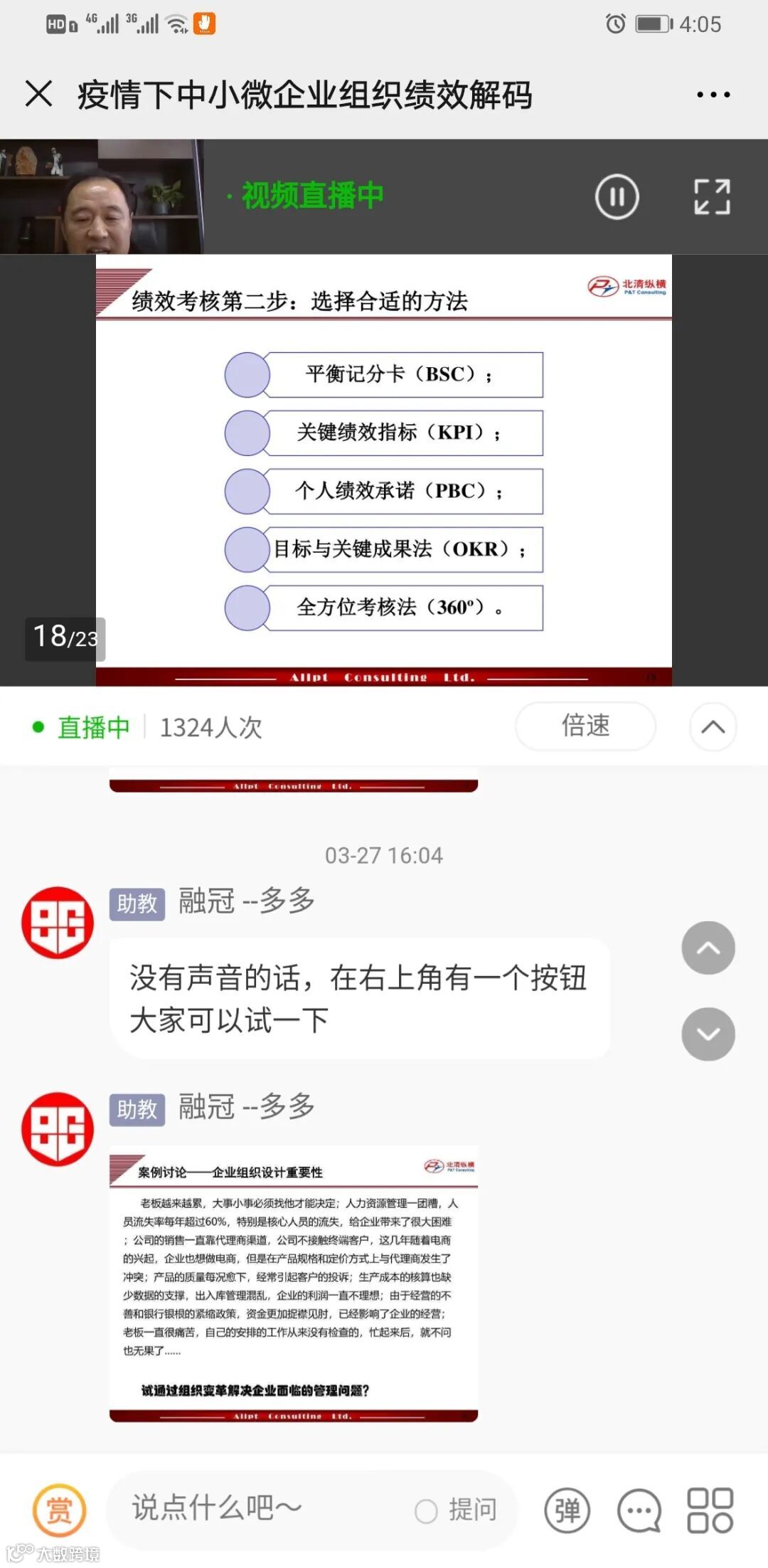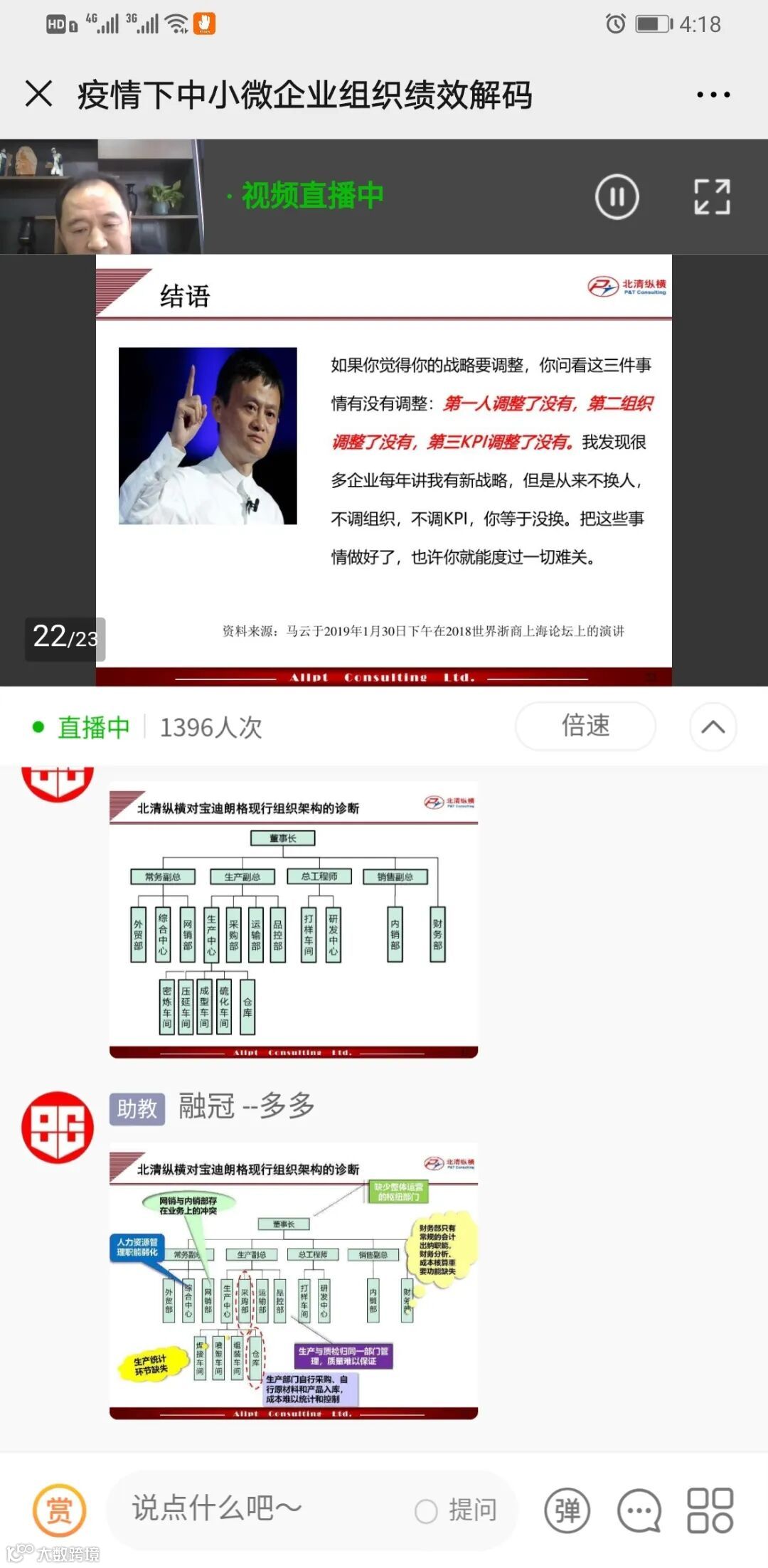 此次直播共计1396人观看,各企业针对自己公司的现存问题纷纷提问,狄老师根据问题做出简要答复,并提醒企业管理层不要忽视企业文化的建设。随着企业的发展,许多问题逐渐显现出来。有效的人力资源管理恰好能够帮助企业管理者发现公司中存在的问题,以便对症下药。