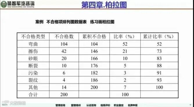 根据所搜集的数据,按不良原因、不良状况、不良项目、不良发生的位置等不同区分标准而加以整理、分类,从中寻求占比最大的原因、状况或位置,按其大小顺序排列,再加上累计值的图形。