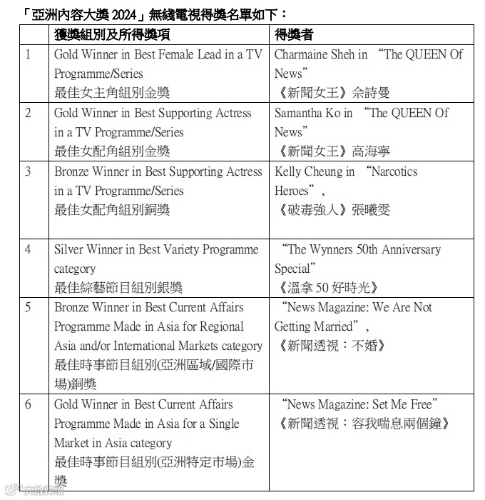 「亚洲内容大奖2024」(ContentAsia Awards 2024)昨晚(9月5日)于中国台湾举行颁奖典礼,合共颁发27组奖项。TVB昨晚共获3金1银2铜6大奖项,包括去年凭台庆剧《新闻女王》获奖无数的佘诗曼及第三度夺奖的高海宁,二人分获女主角及女配角组别金奖;
