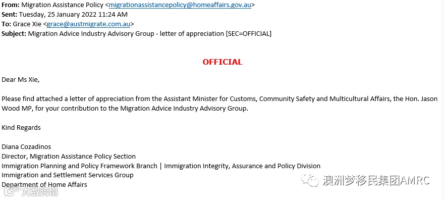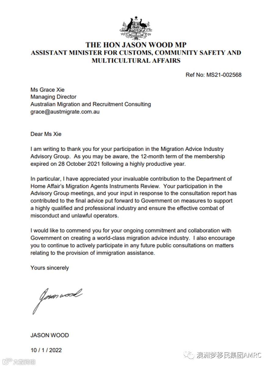 在经历了一年的工作后,海关、社区安全和多元文化事务部助理部长Jason Wood特意写信感谢Grace 女士在这一年里对移民行业的宝贵贡献。