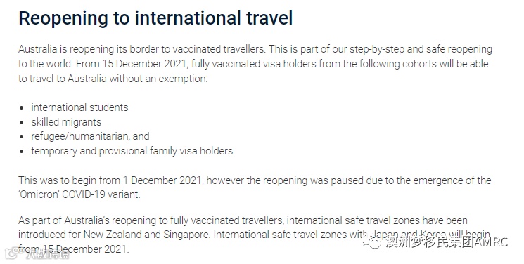 澳大利亚正在向接种疫苗的旅客重新开放边境。这是澳洲逐步、安全地向世界重新开放的一部分。从 2021 年 12 月 15 日起,以下群体的完全接种疫苗的签证持有人将可以无豁免前往澳大利亚: