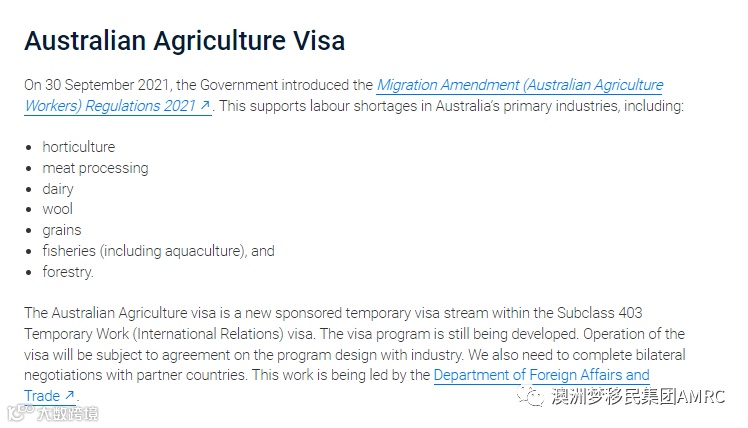 澳大利亚农业签证是 403 类临时工作(国际关系)签证中的一种新的担保临时签证类别。签证计划仍在制定中,签证的操作将取决于与行业的计划设计协议。移民部还需要完成与伙伴国家的双边谈判,这项工作由外交和贸易部领导。