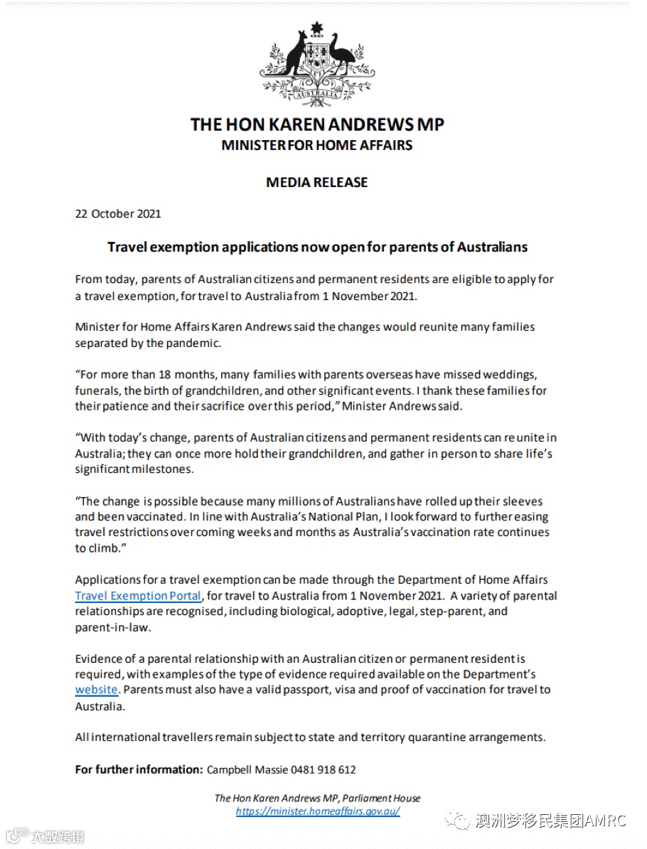 “随着今天的变化,澳大利亚公民和永久居民的父母可以在澳大利亚;他们可以再次拥抱孙子,亲眼相聚,分享生活重要的里程碑。“这种改变是可能的,因为数百万澳大利亚人已经挽起袖子并接种了疫苗。根据澳大利亚的国家计划,我期待随着澳大利亚疫苗接种率的持续提高,在未来数周或数月旅游限制会进一步宽松。”