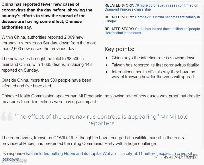 ABC报道,中国官方统计报道 COVID-19冠状病毒病例周日16日新增2009例,比前一天的2600例大幅下降!目前中国感染病例68500例,中国境外500多例。
