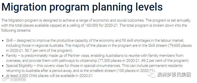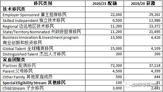 2020年10月8日澳洲家庭事务部公布了2020/2021财年具体的各类移民数量配额。
