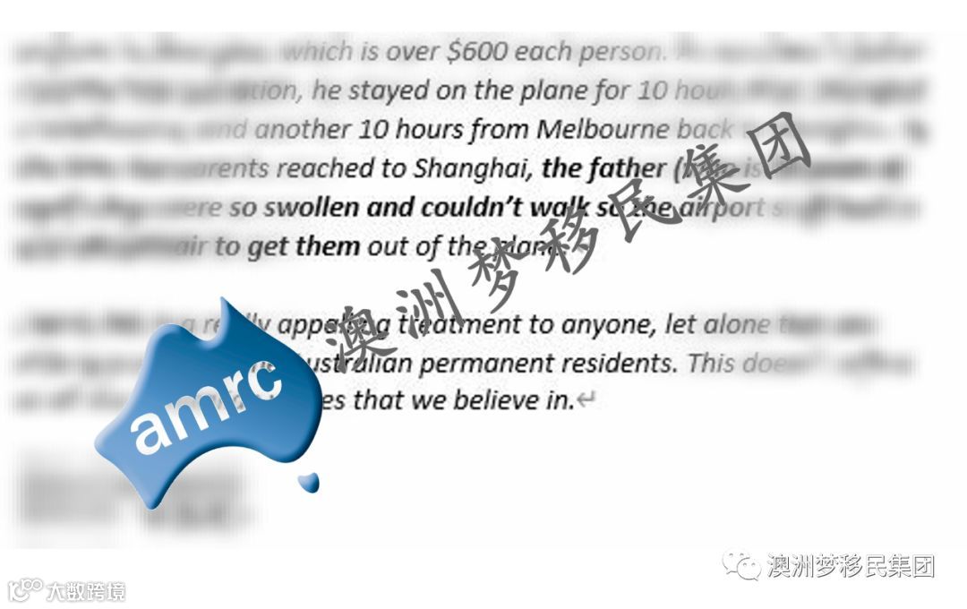 W先生不希望父母有不良入境记录,因此,他选择了离开,并要求他是否可以陪同父母返回中国。边境安全工作人员告诉他,他无法陪同父母,因为他已经通过了海关。(W先生和妻子及孩子已经是永久居民PR,不受入澳旅行禁令限制,已顺利通关——笔者注)W先生甚至没有机会在机场和完全不会说英语的年迈父母道别,他们就被送走了感到非常无助。此外,W先生还要承担父母飞往上海的机票费用,每人超过600澳元。由于W先生的父亲最近刚做了手术,他在上海到墨尔本的飞机上呆了10个小时,从墨尔本回到上海又呆了10个小时。抵达上海时,这位78岁的父亲的腿已经肿得走不动了,机场工作人员只好用轮椅把他们抬下飞机。