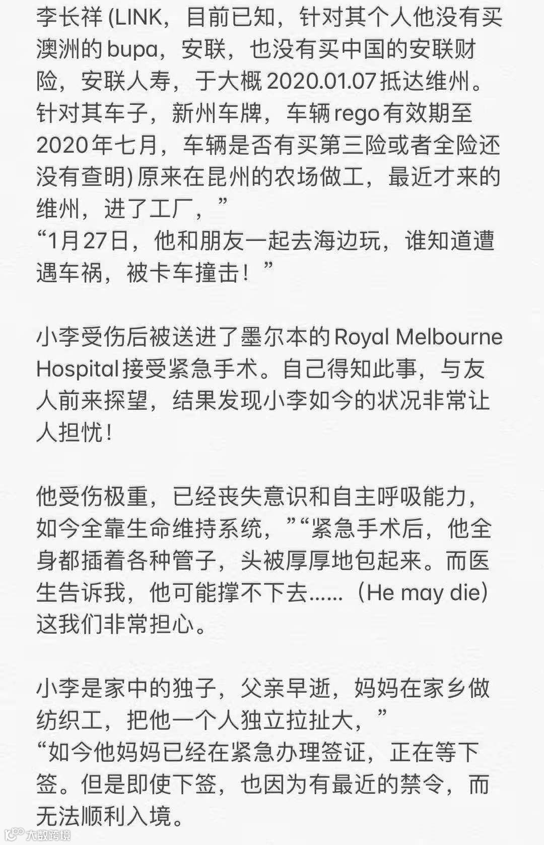 此外,李长祥可以享受维州公路保险,这意味着医疗费和住院费都不需要自掏腰包。