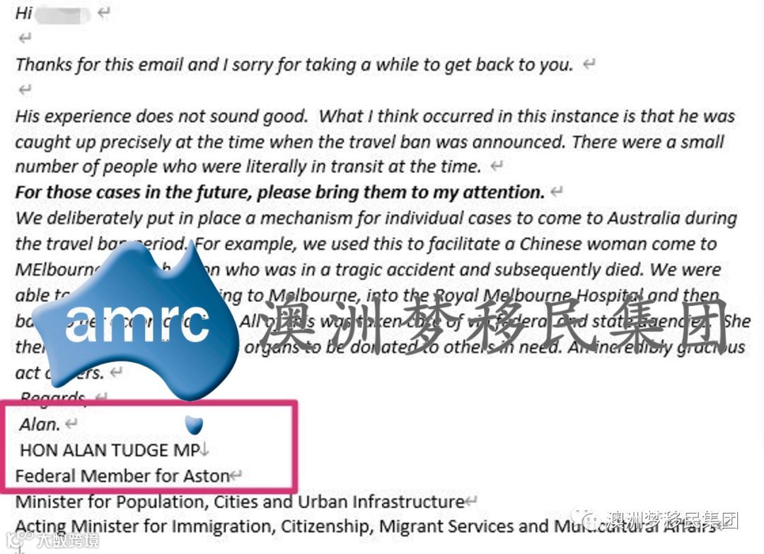 很遗憾他们恰巧在禁令刚刚颁发的时候遇到这样的事情,以后再有的类似情况,请直接联系我。我们建立了一个灵活的入境管理机制,并致力于在旅行禁令期间帮助有特别需求的案例进入澳洲。我们帮助了一位中国母亲来墨尔本看望她的儿子,她的儿子在一次令人悲痛的事故中脑死亡去世。我们帮助这位母亲来到墨尔本,去皇家墨尔本医院和儿子告别,并在澳洲停留。所有这些都由联邦和维州部门运作。这位母亲慷慨地捐献了儿子的器官给其他需要的人,她的亲切和伟大令人难以置信。