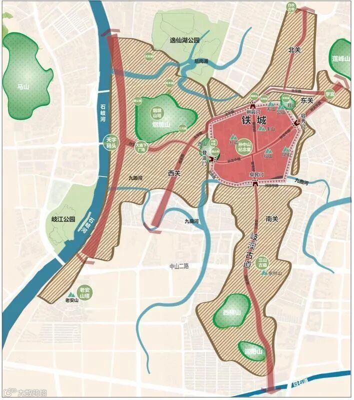 ▲ 香山古城历史城区“三河七山”山水格局和“一城四关”的城厢格局。(来源:《香山古城城市设计》方案)