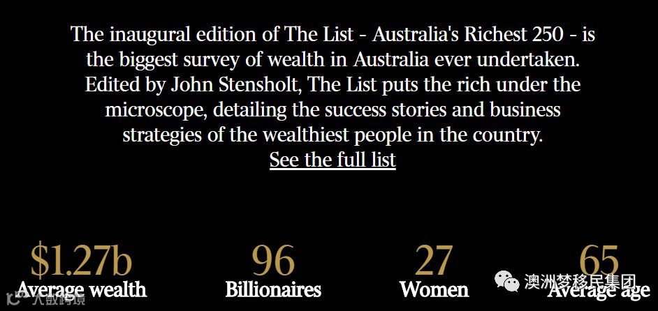 上周末《Weekend Australian》发布了澳大利亚最富有的250人排行榜。数据显示,富豪平均财富为12.7亿澳元,其中亿万富翁96人,女性27人,平均年龄65岁。多名华人富商登上榜单。