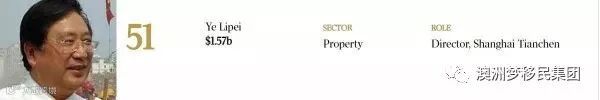 中国台湾商人傅显达(Gordon Fu)以17亿澳元的财富排名第42位。出生于上海的叶立培则以15.7亿澳元的财富排名第51位。