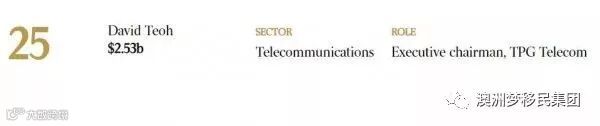 此外,马来西亚华裔通讯大亨David Teoh以25.3亿澳元的身家排名榜单第25位。