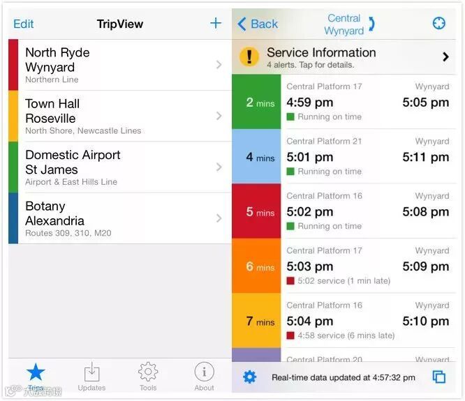 悉尼、墨尔本出行交通状况查询APP。支持地铁、公交和游船时间查询。现在还有站台显示功能,很实用,如果您在悉尼,或者要去悉尼、墨尔本的话,下一个TripView是个不错的选择。所有时间表数据存储在您的手机,即使没有网络的时候也可以使用。使用这个APP可以准确知道几点到站、是否准时、是否延误,非常实用。通过选择起点和终点的站名,可以清楚地看到每一班车的开车时间和站台或者站点信息。