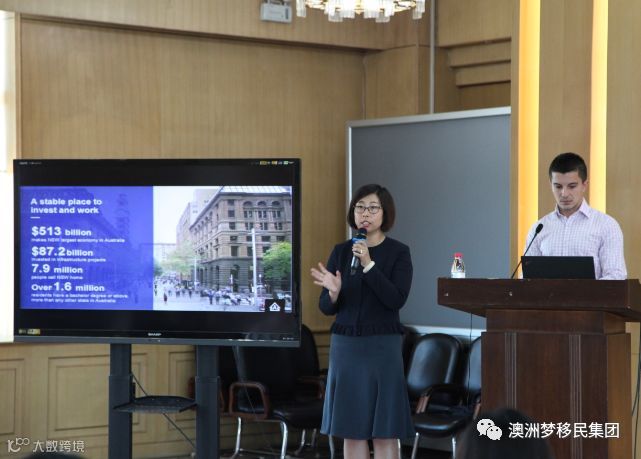 新南威尔士州政府技术商业部移民专员George Veneris为与会嘉宾宣讲商业移民签证类别和州政府担保要求,澳洲梦移民集团AMRC资深移民顾问Michelle同声传译。