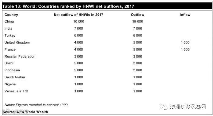 高净值人士净流出国家中,中国以10000人位居榜首。印度以7000人位居第二,土耳其以6000人位居第三名。英国和法国有人走有人来,流出5000人,流入1000人,以净流出4000人并列第四名。