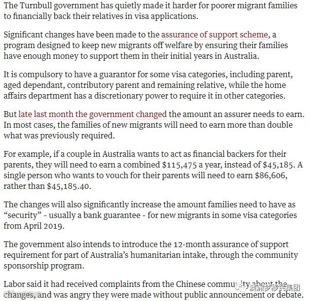 月初,联邦福利署Centrelink悄悄把在澳子女给父母移民143签证做经济担保Assurance of Support AoS的要求提高一倍并即时生效的做法,在社会引起强烈反响。尤其华人群体对这种“暗箱操作、一棍子打死”的做法非常反感。我们也对此事向大家做了及时报告,并积极关注事态的进展。