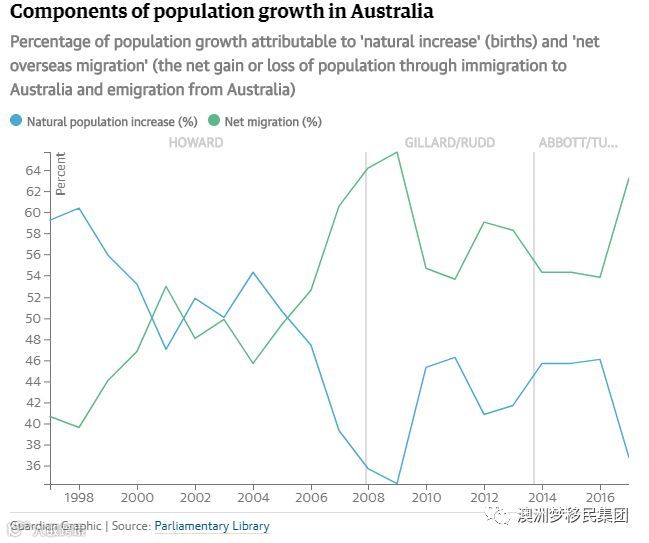 自2005年以来,与澳大利亚本土出生的婴儿相比,移民成为澳洲人口增长的驱动力。目前,移民占澳大利亚人口增长总量约60%,如果没有移民补充,澳大利亚人口自然增长数量在下降。