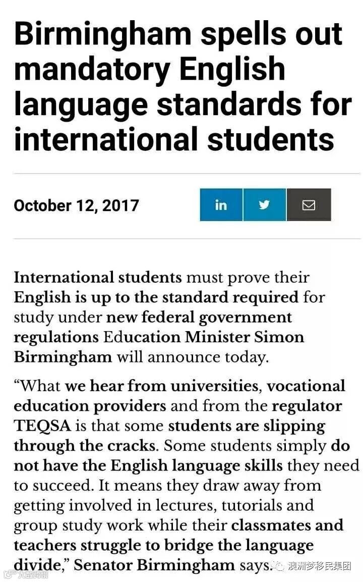 澳洲教育部长表示:“我们发现,近年来不少留学生的真实水平并未达到他们所申请的澳洲大学的英语能力标准,可他们却还是进去了。”说白了就是,很多外国学生在语言能力方面,其实是不够格成为一个澳洲留学生的。