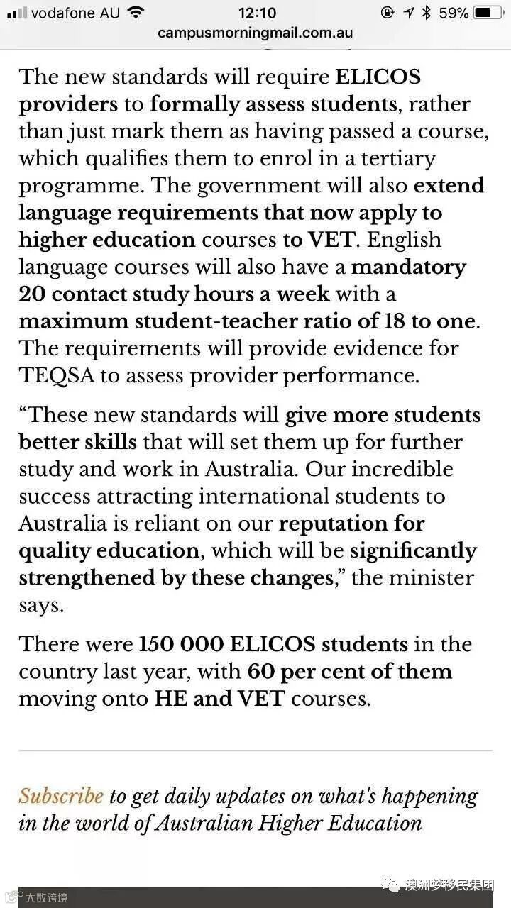去年,有15万名留学生上了ELICOS课程,国际教育在澳洲是一个价值286亿澳元的巨大产业。教育部长表示:“政府引进这个新标准,将确保更多留学生拥有足够的英语水平,能与人交流,能在课堂上有所贡献,并且保证他们最终能在澳洲取得成功。海外留学生目前并不拥有能在澳洲取得成功的英语水平。也就是说,他们跟不上老师讲的内容,无法接受辅导,不能参与小组讨论,他们的同学和老师不得不费尽力气帮助他们。这对留学生,对澳洲本国学生以及他们的老师,都是不公平的。澳洲之所以能吸引大量留学生,是因为我们在教学质量上有着良好的声誉,这样的改革措施将进一步加强我们的声誉。”