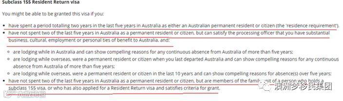 一, 申请人必须在过去5年内,以合法永久居民身份在澳洲累计居住至少满2年才能获得155永居回头签证。这是唯一必要条件,无论申请人有无任何对澳洲有利的各种重大纽带联系,有无澳洲永居或公民的配偶或子女在澳洲;