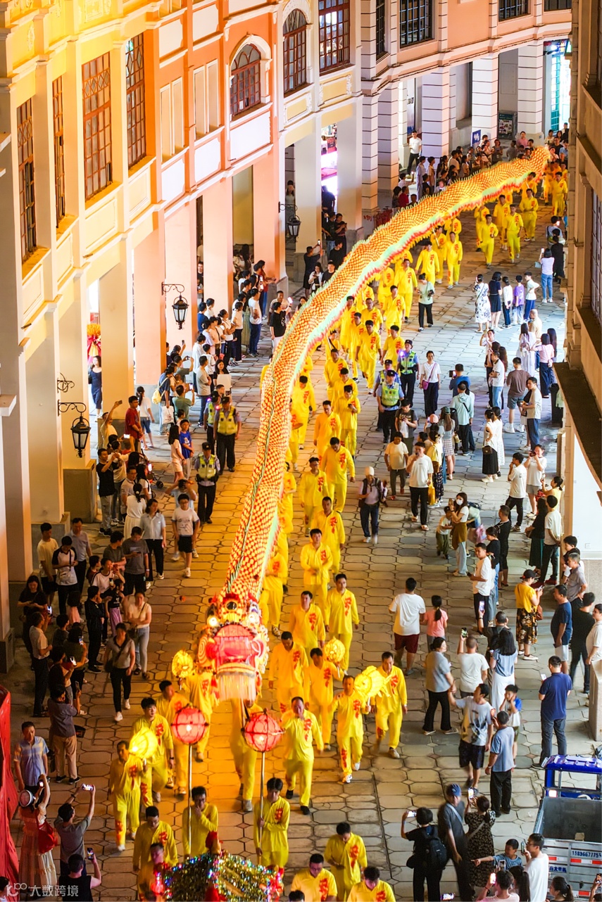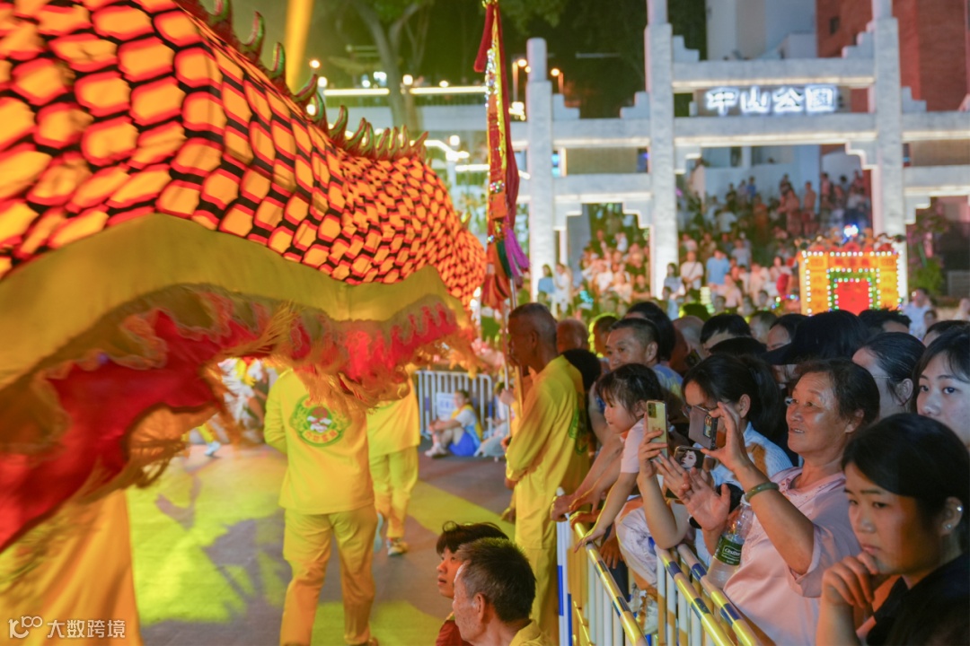随着夜幕降临,石岐街道华灯初上,星河璀璨,一河两岸游人如织。活动现场,古镇六坊云龙、石岐醒狮、申明亭鹤舞、西区醉龙等国家、省、市级非遗项目展演巡游队伍威风凛凛、灵动多变,每一个动作都充满了力量与激情,瞬间吸引众人目光。巡游队伍所到之处,道路两侧观者如云、熙熙攘攘、人声鼎沸,惊讶声叫好声不绝于耳,让市民游客皆沉浸式地感受非遗之魅力,领略传统文化之精髓。