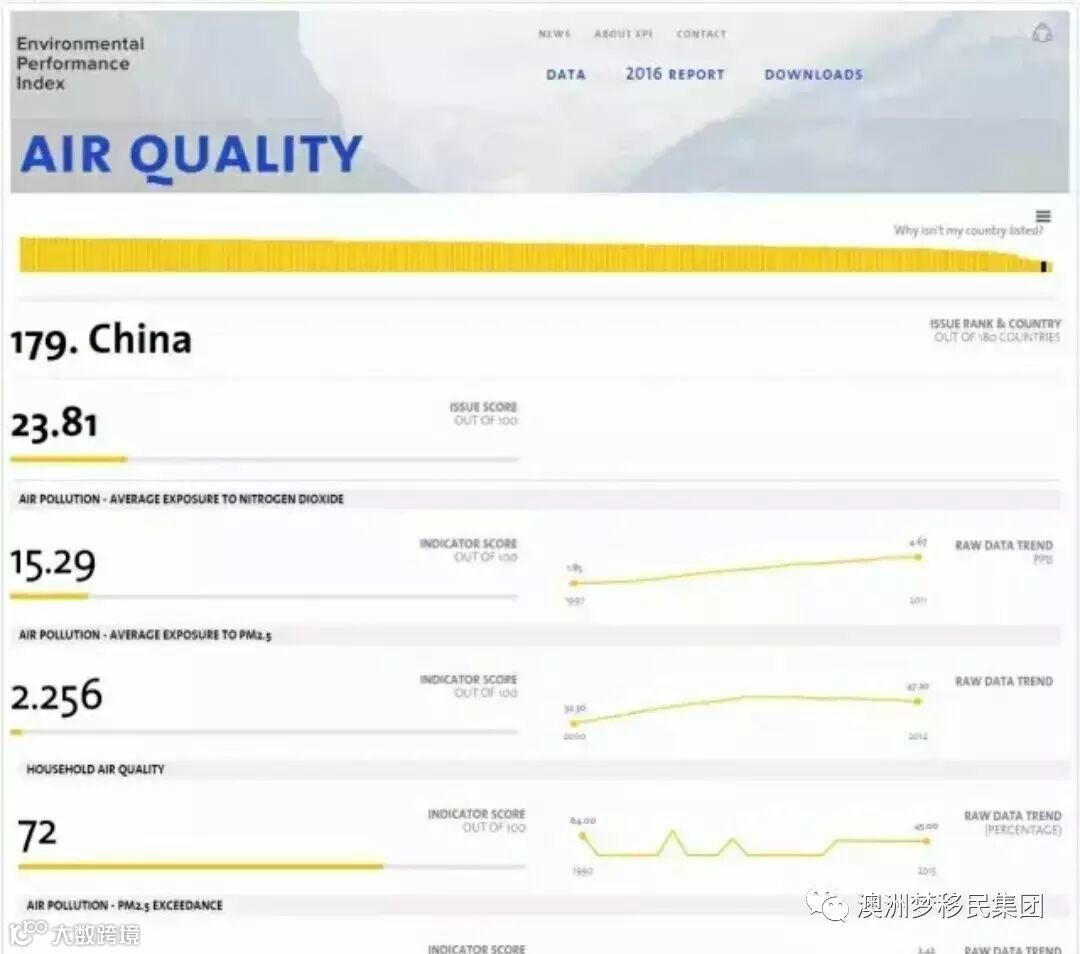 中国在EPI排名179,四项指标得分为15.29、2.256、72和0,综合得分23.81,险胜孟加拉,排名倒数第二。